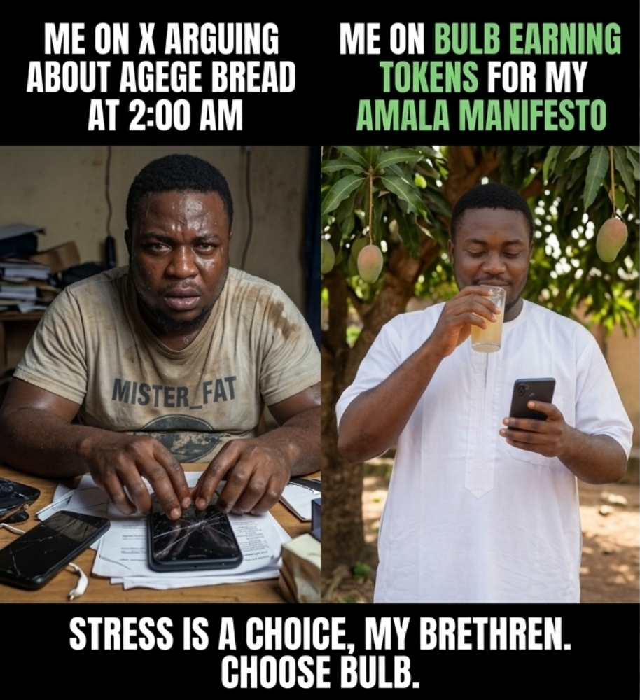 Even my data is respecting itself now. Because instead of doom-scrolling for three hours, I open Bulb, read three quality articles, drop thoughtful comments, write one post, and close the app feeling like a responsible adult. Maami even noticed. She said, âFat, you no dey shout at your phone again. Wetin happen?â I just smiled and said, âMama, I don enter Bulb. X don lose one customer.â