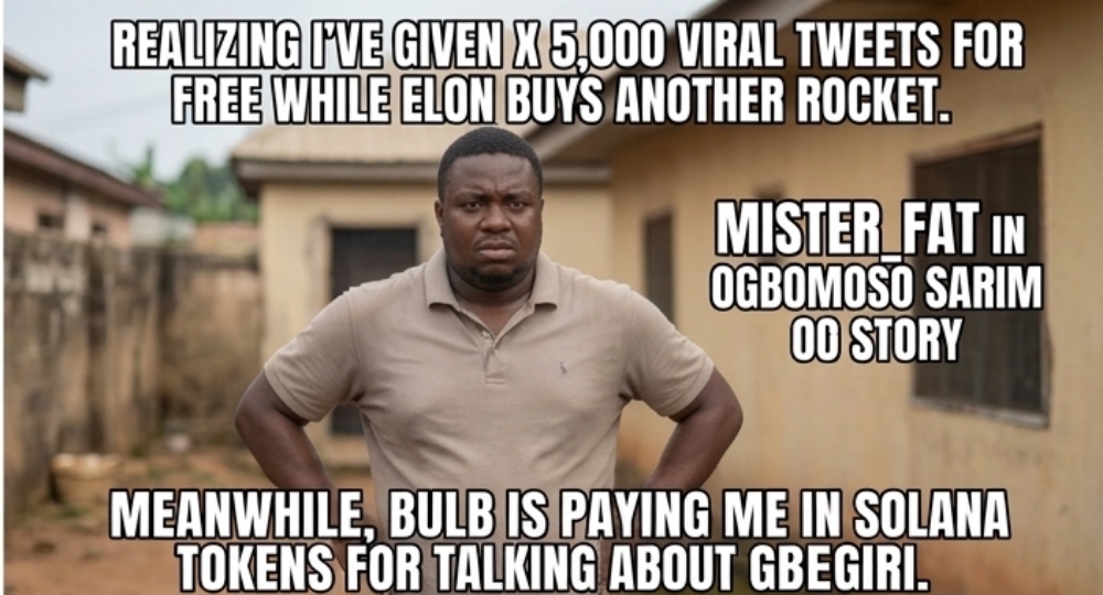 I read a brother in Abuja breaking down how to build a Solana dApp. I read a sister in Ibadan writing poetry that made me feel things. I read a guy in Canada (original Ogbomoso blood) sharing how heâs using Bulb to fund his masterâs degree. Everybody is creating. Everybody is earning. Nobody is screaming.