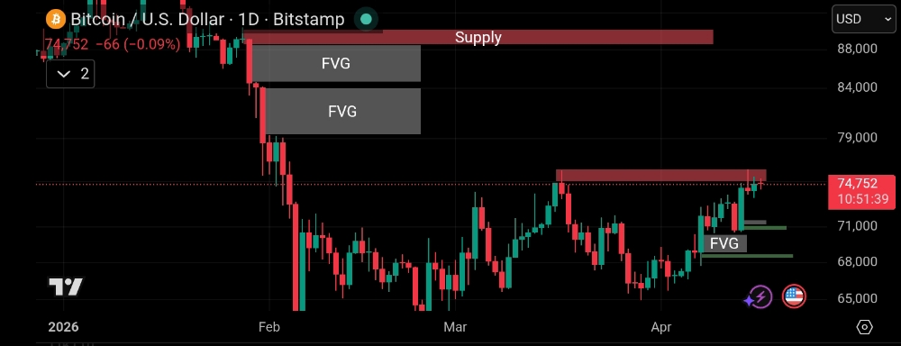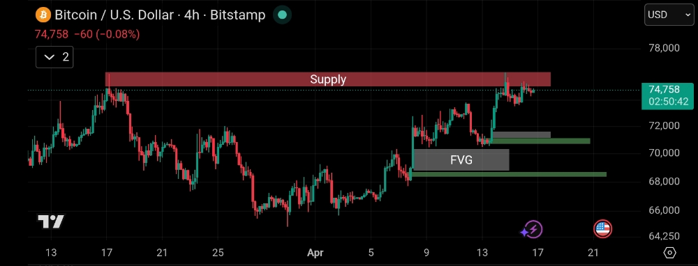 of a heavy supply zone around $74,700, but it’s not letting us in just yet.
