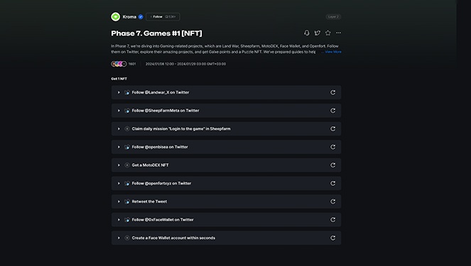 Kroma'nın 9 haftalık bir görev serisi mevcut ve şanslıyızki eski fazlar hala kapatılmamış. Özellikle Manta ağının kullanıcılara verdiği hatrı sayılır airdroptan sonra bu tür ağları hakettiği şekilde kullanmaya karar verdim. Sağımız, solumuz her tarafımız görev oldu biliyorum fakat bence amaçsızca bir ağda tx atmaktansa devam eden bir görev sürecinin parçası olmak bana daha mantıklı geliyor :) Çoğumuz Linea'dan aşinayız. Benzer bir yapı burada da mevcut faz, faz ilerleyeceğiz. Görevler kolay fakat biraz masraflı, 7 faz için yaklaşık 30 dolar işlem maliyeti bulunmakta (Gwei 15-16) gelecek görevlerde bu masraf artabilir. Bunu bilerek ona göre başlamaya karar verin :) Etkinlik 28 Ocakta sona erecek.