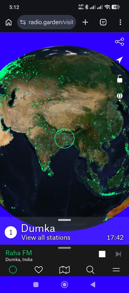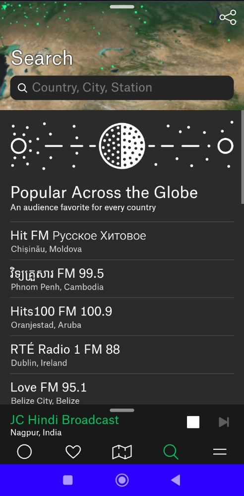 Imagine a 3D globe of the Earth covered in thousands of tiny green dots. Every single dot is a live radio station broadcasting right now. You just rotate the globe with your finger on your phone, tap a dot, and suddenly you’re listening to a live morning show in Tokyo, a jazz club in Paris, or a news broadcast in Taiwan.