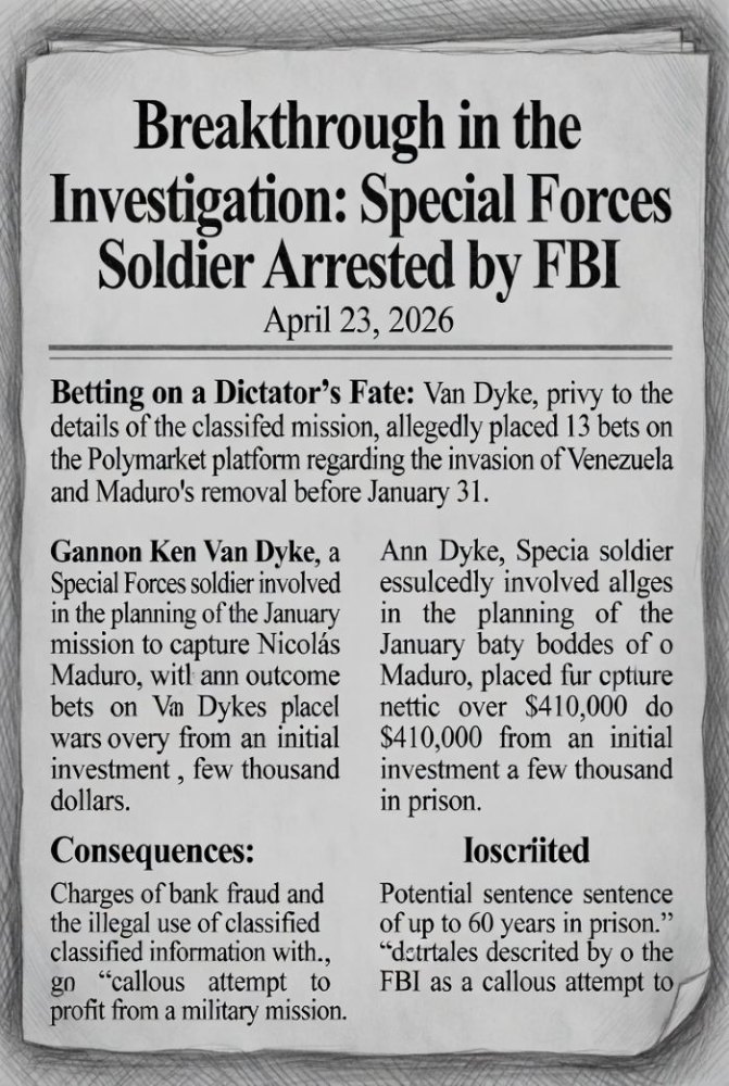On April 23, 2026, federal agents arrested Gannon Ken Van Dyke, a Special Forces soldier who participated in the planning of the January mission to capture Nicolás Maduro.