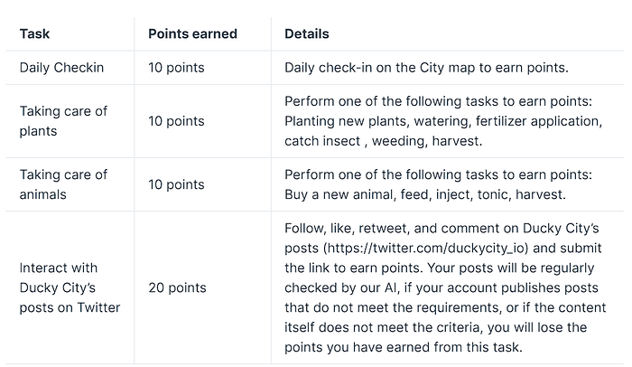 To qualify for the airdrop, users must actively participate and complete the tasks specified on ducky.city. After the end of an epoch, we take a snapshot of the user’s activities and allocate tokens based on their points.