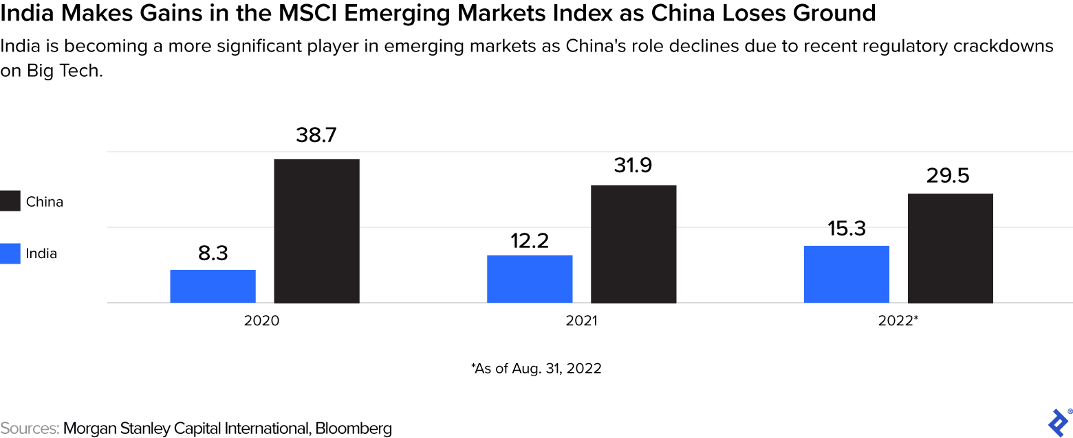 China’s loss is India’s gain, as their relative weights shift in the MSCI Emerging Markets Index.