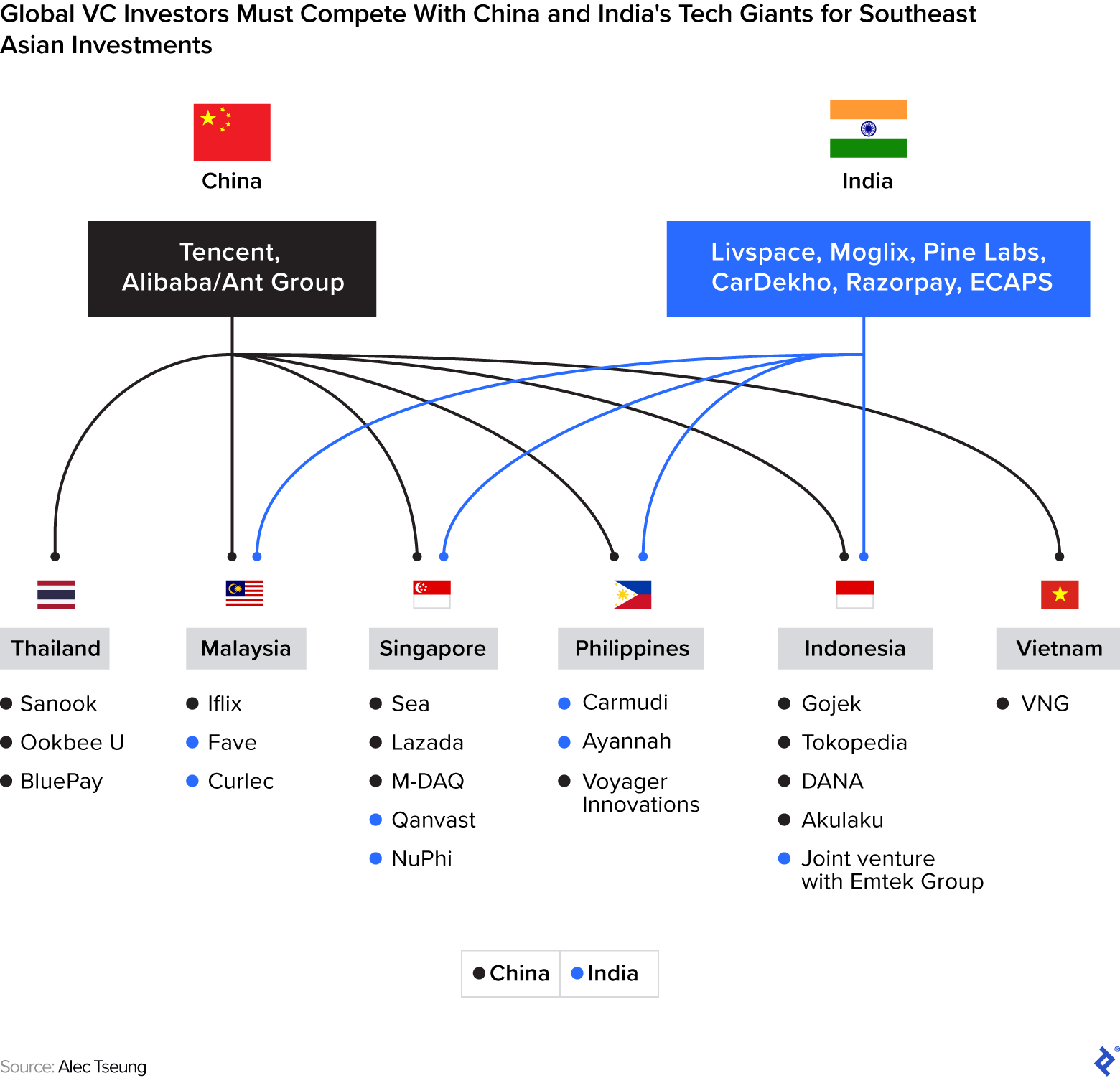 Tencent, China’s Alibaba, and India tech giants like Razorpay, Moglix, and Pinelabs are more frequently competing with global VC investors for a foothold in Southeast Asia. Given their strategy to expand through acquisition, these larger cash-rich companies are often more willing to assign a heftier price tag to a target company than a foreign VC investor might be willing to pay. And existing shareholders may prefer to sell the company to these strategic investors rather than to foreign venture investors focusing primarily on financial returns.
