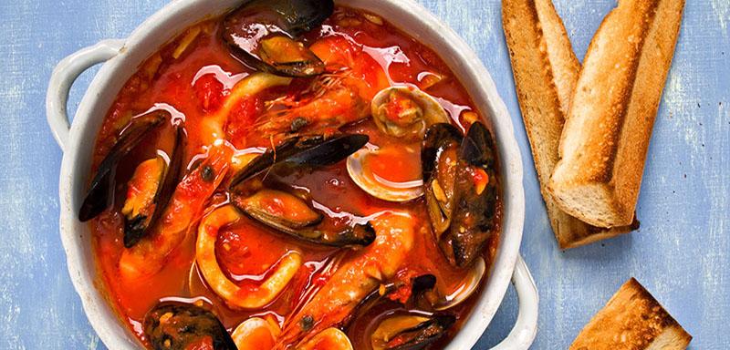 5. Cacciucco: Hailing from the coastal regions of Tuscany and Liguria, cacciucco is a flavorful fish stew that showcases Italy's seafood bounty. It typically includes an assortment of fish and shellfish, cooked in a tomato-based broth with garlic, onion, herbs, and spices. This complex and aromatic stew is traditionally served with crusty bread to soak up the flavorful broth.