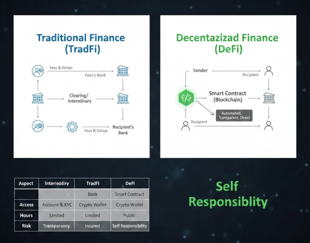 Think of DeFi as an automated financial engine that runs 24/7 and is accessible to anyone with an internet connection and a crypto wallet.