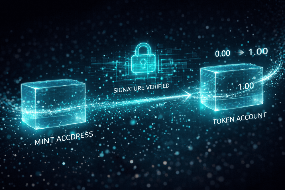 With the mint and ATA established, the Token Program executes the minting instruction. This increases the balance in the ATA and the total supply in the Mint Account, authenticated by the private key of the Mint Authority.