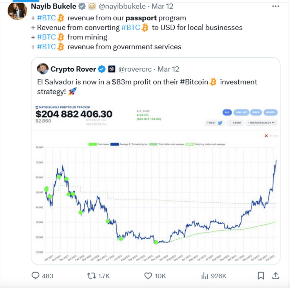 Reflecting on President Bukele's role in spearheading El Salvador's pioneering journey into Bitcoin adoption, including making it the first country to declare Bitcoin as legal tender, and his recent reelection, which underscores the popular support for his innovative policies.