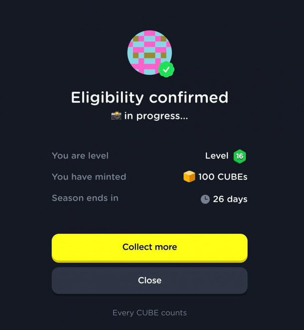 Once we collect all 100 cubes, we become ELIGIBLE to airdrop. Simple and fast, and most importantly open airdrop.