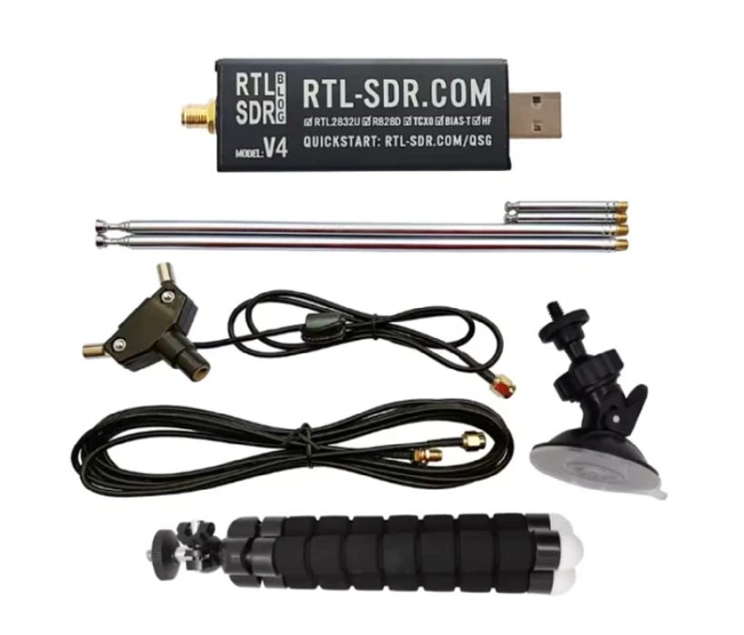The aim of the game is cheap and easy, as such it makes sense that the rtl-sdr is the recommended radio of choice. With the V4 model currently released, it provides additional features over the V3 and comes with a mount, coaxial cable and two antennas.