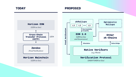 Then EON is optimized, focusing development on smart contract precompiles, core functionality, and tools for ZK applications and rollups. $ZEN migrating to its new home on EON as a token frees up a large portion of the remaining one-third of yet-to-be-issued supply to incentivize ZK projects to make Horizen their home. A new token for the proof verification layer would do the same with incentives to attract ZK projects to verify with “New Horizen.”
