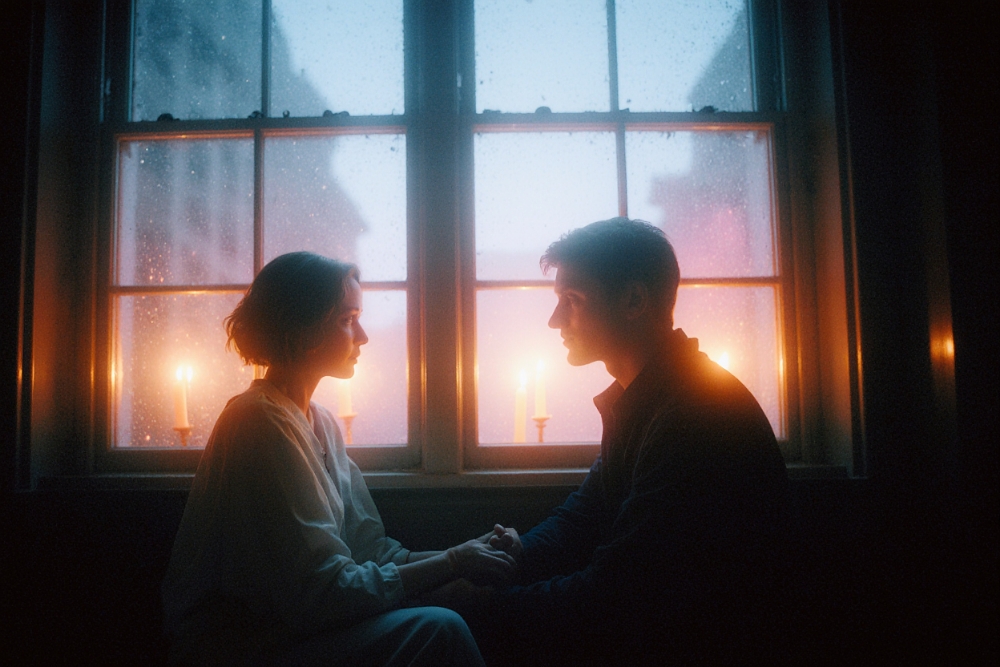 The rain thickened, the city vanishing into mist. And still, they stood in the half-light, the candle between them burning lower with each passing moment.