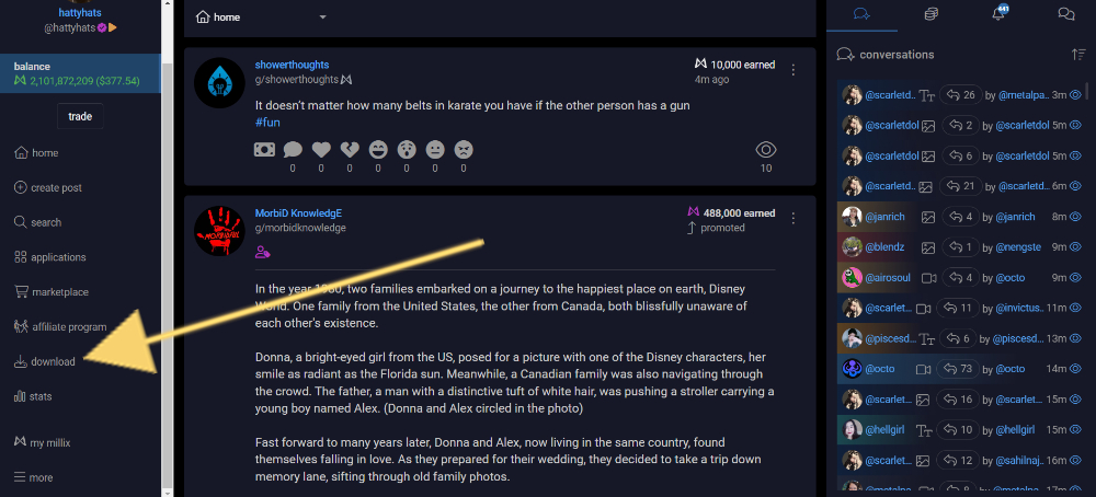 The Tangled browser is the backbone of the Millix ecosystem. To download the browser on the web version you will go to the menu on the left hand side of your screen and scroll down and find the button "Download". If you are using the phone you will need to click the three lines on the bottom left of your screen (This brings up your menu). You then scroll down until you see the button download.
