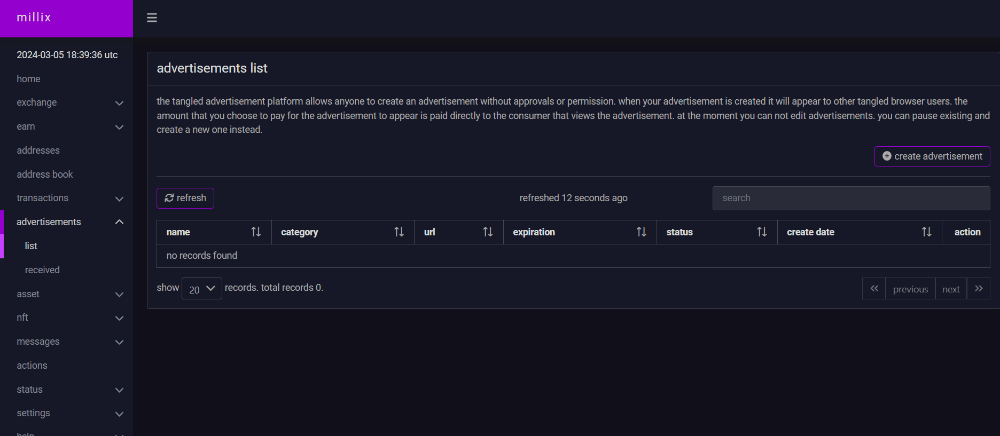 Millix is the reserve currency of Tangled. It was released on January 5, 2023. Millix is open source and was designed from the ground up to use micropayments and data with speed and low energy usage. Tangled uses Millix as its reserve currency for user transactions, and advertisements and as the cryptocurrency platform for minting, storing, and transferring NFT assets. This allows anyone who uses the Tangled browser (The Millix Node) to be a key player in the Millix ecosystem.