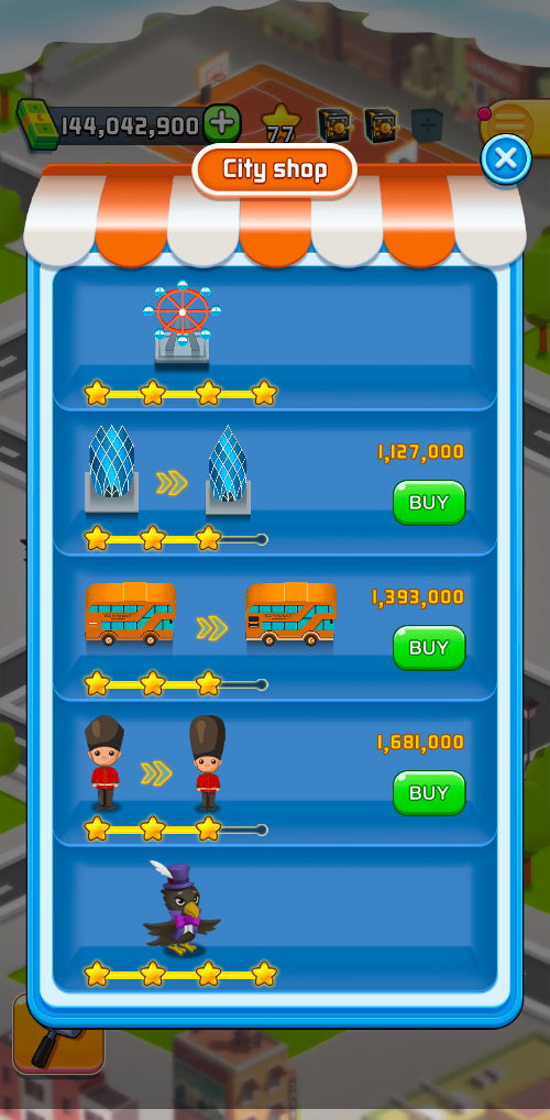 Each city in the game comprises five buildings that must be constructed and can undergo 4–5 upgrades. Upon achieving the highest upgrade level for all buildings, players progress to the next city, unlocking new levels, gameplay elements, and additional features, resulting in increased rewards.