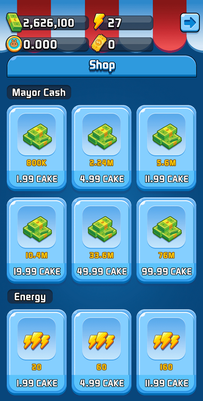 Pancake Mayor offers a free-to-play experience, as Energy restores automatically. However, players have the option to purchase additional Energy or in-game currency (Mayor Cash) using CAKE.