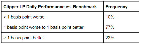 Secara keseluruhan, Clipper mengikuti DRP dengan ketat sambil tetap sedikit di depannya, menyelesaikan interval hampir 40 basis poin di depan benchmark. Clipper berada dalam satu basis poin dari benchmark selama lebih dari tiga perempat hari dalam periode tersebut. Untuk hari-hari di mana Clipper LP dan benchmark berbeda lebih dari satu basis poin, Clipper berada di depan benchmark lebih dari dua pertiga waktu (23% vs 10% hari).