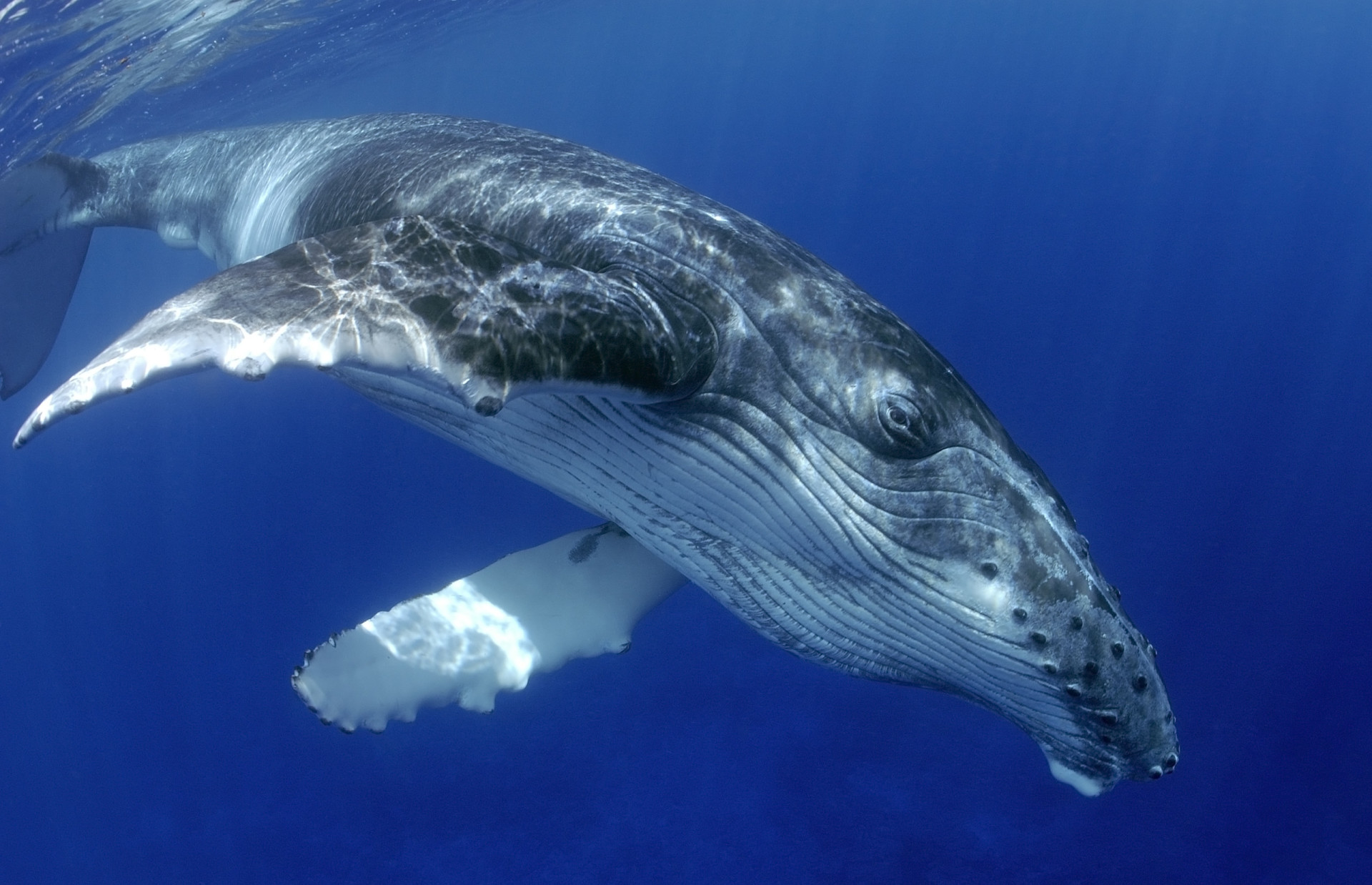 Besides their occasional visits to the surface for air, humpbacks also make a habit of propelling their tremendous bodies out of the water and back in, making a massive splash. Experts think that whales do this in order to shake barnacles and parasites off of their bodies, or maybe just for the fun of it!