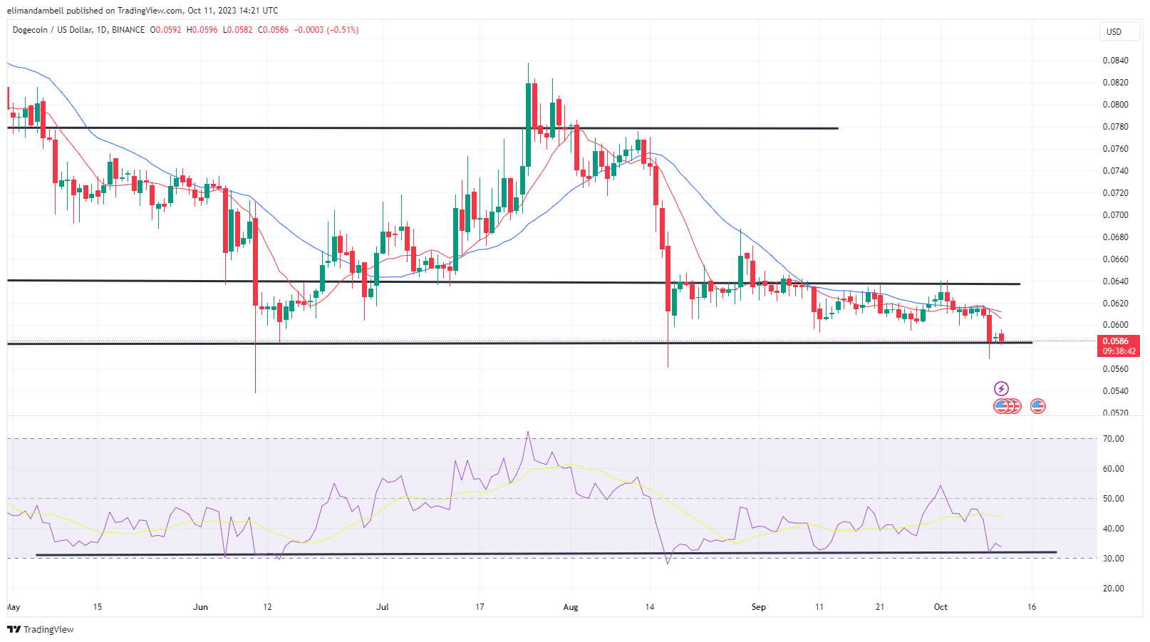 As a result, DOGE continued to move away from a price floor at $0.05840, which was broken on Monday, sending price to its lowest point since mid-August.