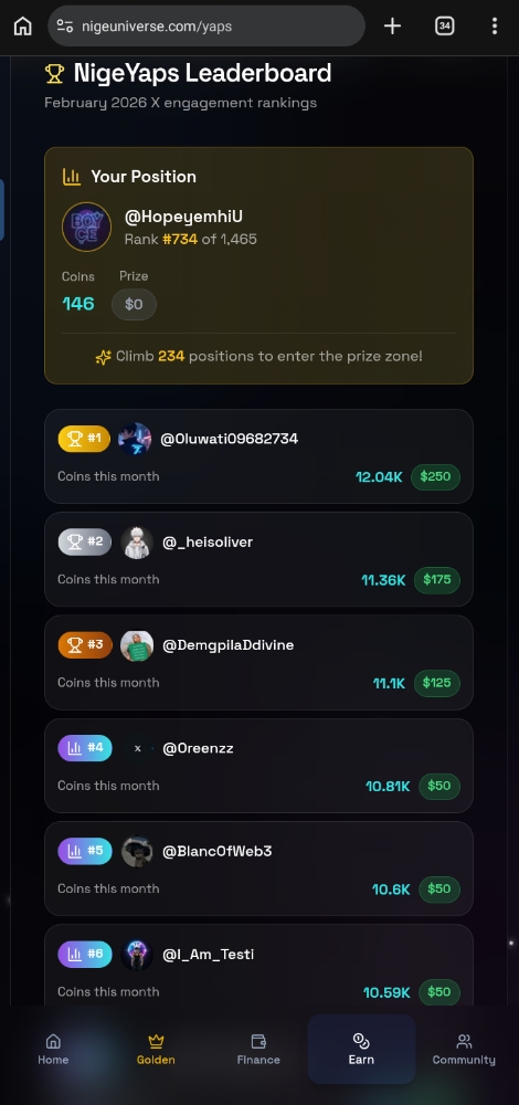 GM CT! 🚀 NigeYaps finally back counting after that small glitch — I'm at rank #734 out of 1,423 active yappers in the February Race. Prize pool reset coming in just a few days, top 500 get $3–$250. From Ibadan, I'm pushing hard every day because this is one of the few places where real quality yaps still pay.