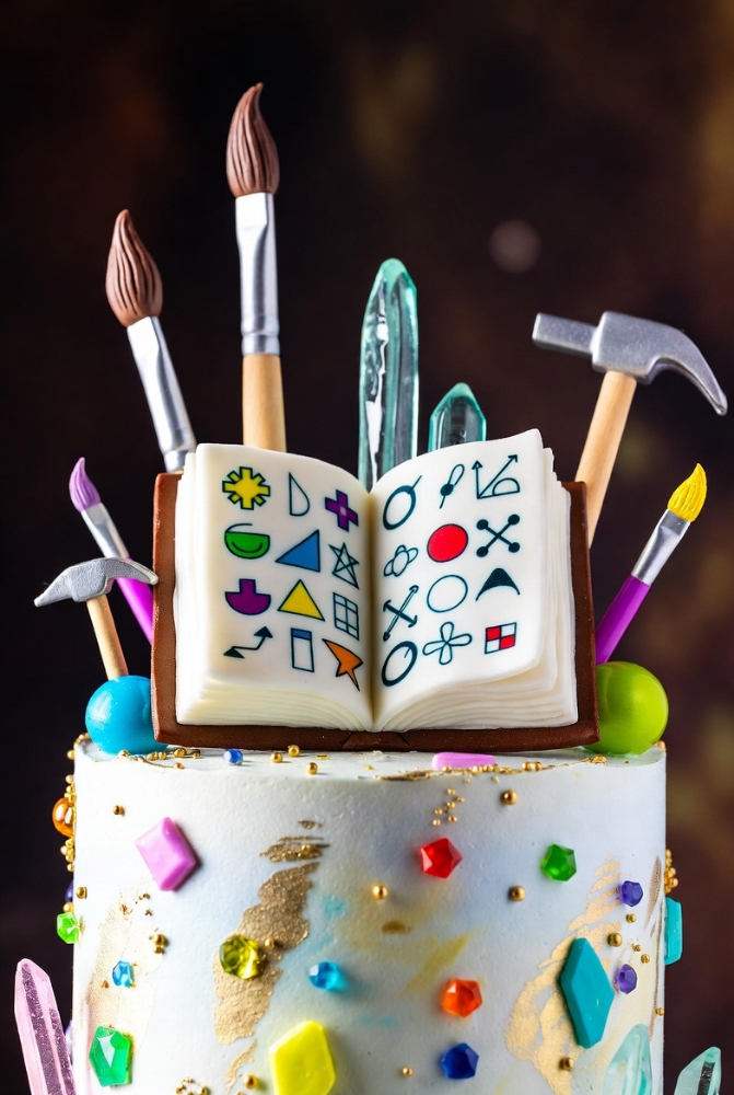 The Legend Weaver CakeMarbled like ancient scrolls yet fresh from the oven, this cake is where stories are baked into reality. Gems sparkle like on-chain milestones, and the open storybook on top invites you to write the next chapter. Every tool sculpted in fondant honors the creators who keep the magic alive.