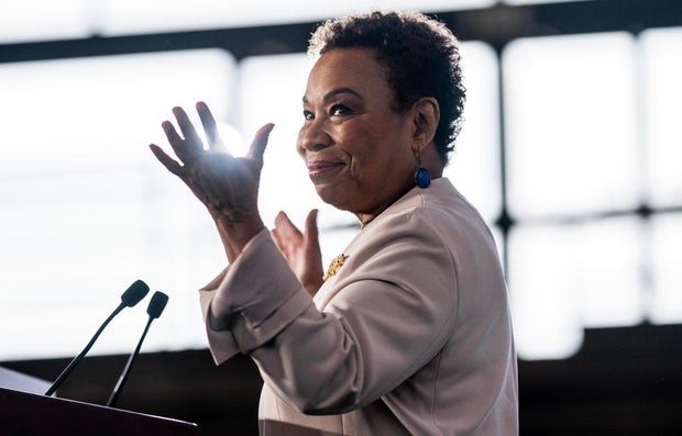 Rep. Barbara Lee speaks to supporters during her campaign launch rally at Laney College in Oakland, California on Feb. 25, 2023.