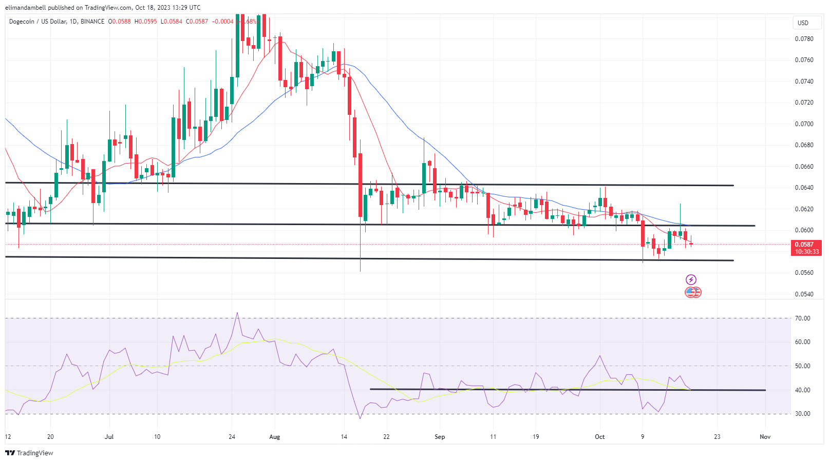 DOGE/USD hit a bottom of $0.0588 during today’s session, less than 24 hours after peaking at the $0.05961 point.