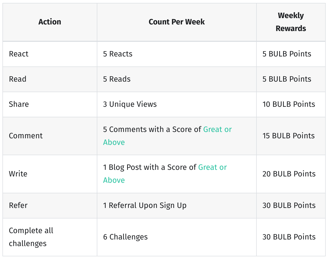 It’s pretty simple really. Uses earn points for sharing, reading, and creating content. Each week, these points will be used to ascertain a position on the leader board which is then converted to bulb tokens. So if we play our cards right, we can use the leaderboard to obtain tokens via airdrop.