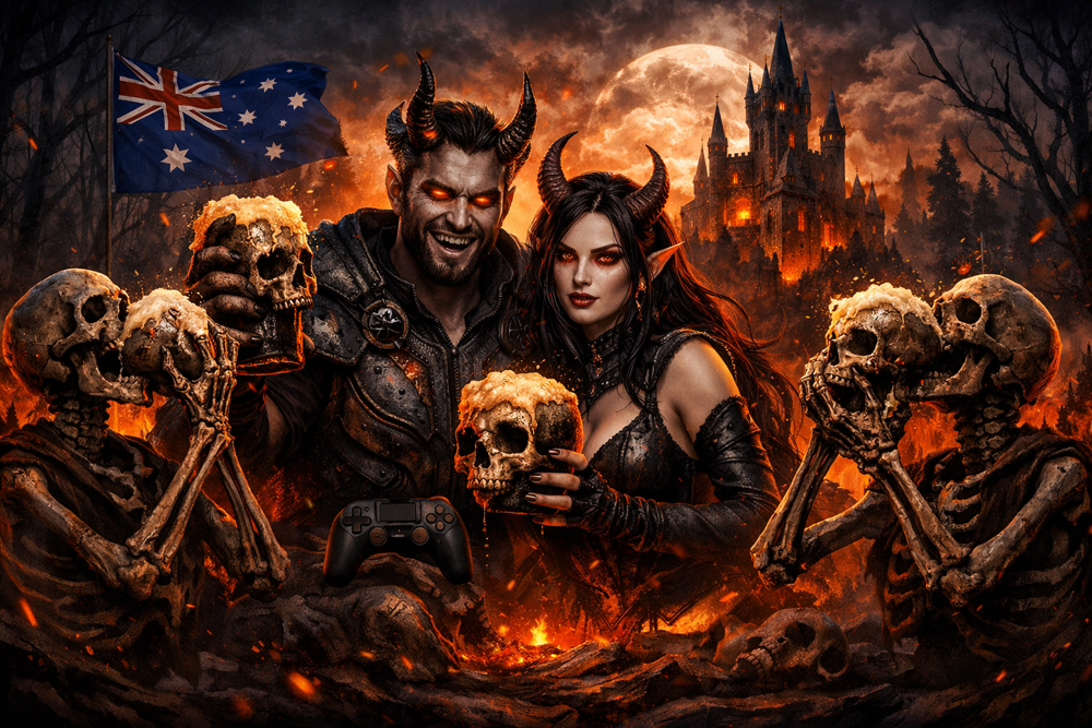 The concept came together around three things I genuinely love. Gaming. Cold beers. And keeping it real with good people. From there the creative direction basically wrote itself. Dark fantasy aesthetic. Hellfire and skulls. Glowing eyes and demonic energy. Paired with the Australian flag because I'm proud of where I come from and I wanted that to be front and centre.
