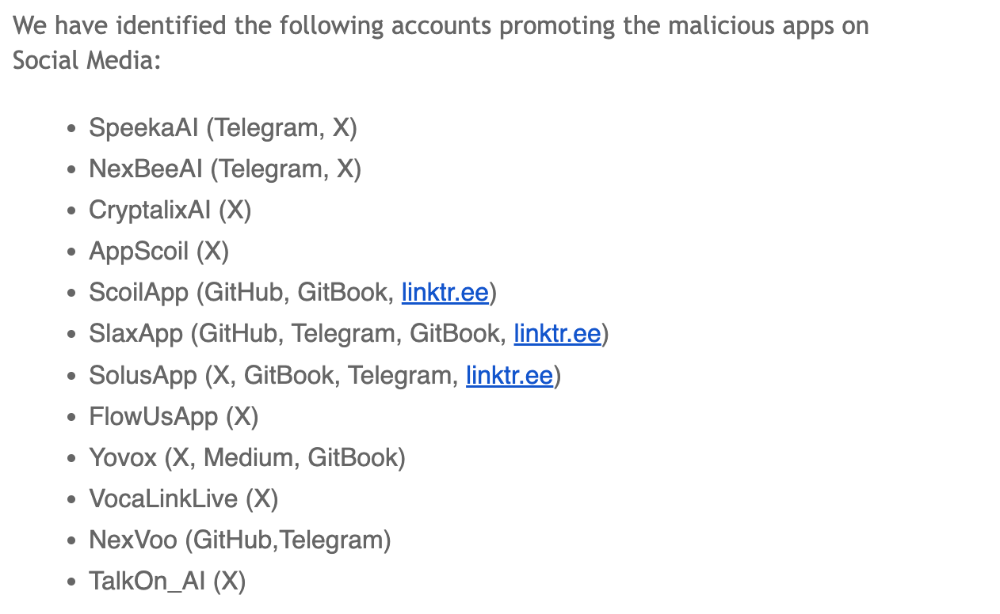 In that report, they list “AppScoil (X)” and “ScoilApp (GitHub, GitBook, linktree)” as part of the infrastructure around a malware campaign.