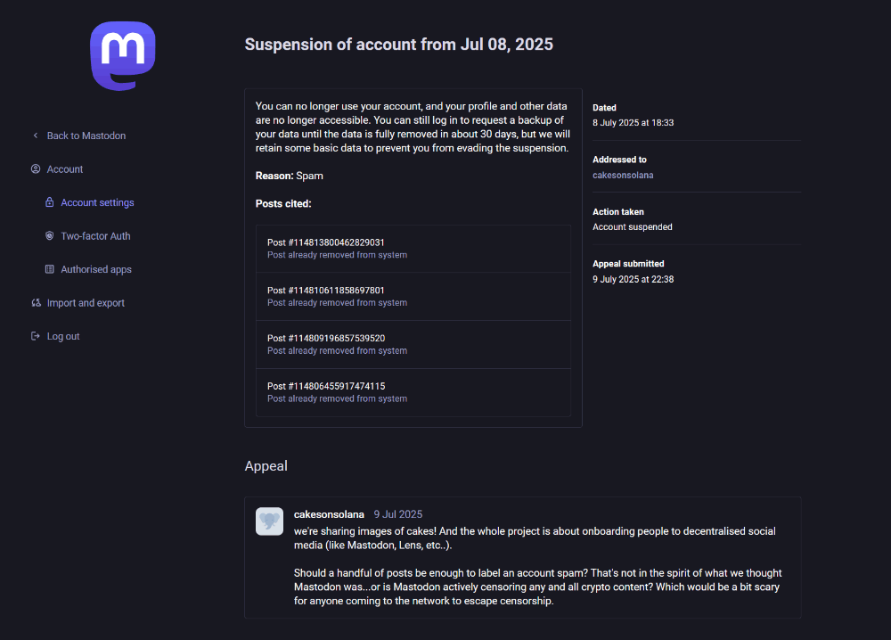 Mastodon never replied to us https://mastodon.social/disputes/strikes/195723