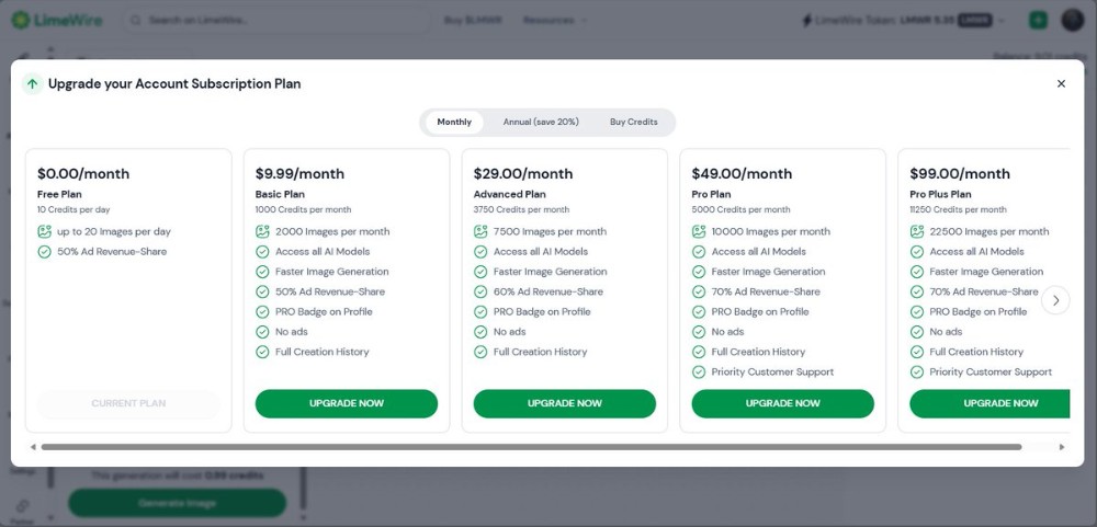 After registering with LimeWire you can use AI tools for free. You will receive 10 credits for creating up to 20 AI images per day. You will also receive 50% of the advertising revenue share. You can get even more benefits with premium plans.