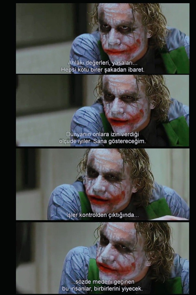 Halbuki insanlık Batman gibilerin şevkat ve hümanizminden de Joker gibilerin alaycı ve yıkıcı eylemlerinden de daha fazlasını hakkediyor: Ölümün ve yaşamın, acıların ve mutlulukların çok daha adil bir şekilde dağıldığı, şiddetin ve korkunun değil paylaşımın ve tüm farklılıklara rağmen bir arada yaşama tutkusunun iktidarda olduğu başka bir dünyayı…