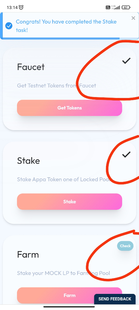 This link https://testnet.dappad.app/stake-and-farm?tab=stake Come to the ten stake screen and have some satke here. And click stake and confirm from your wallet