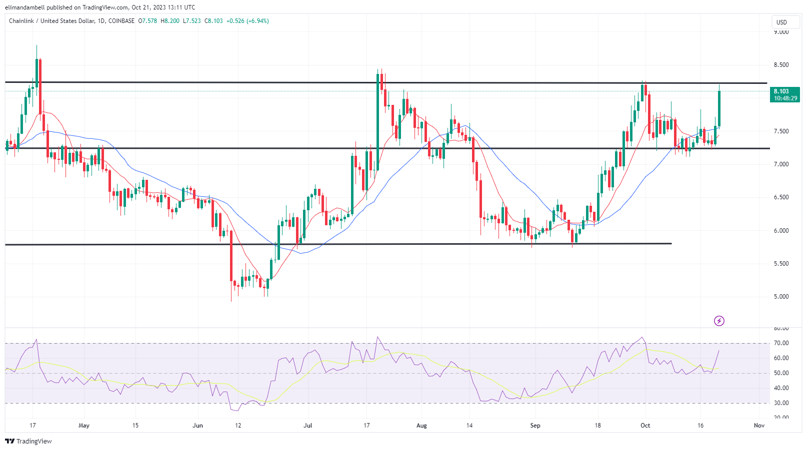 After trading at a low of $7.54 on Friday, LINK/USD peaked at $8.15 earlier in Saturday’s session.