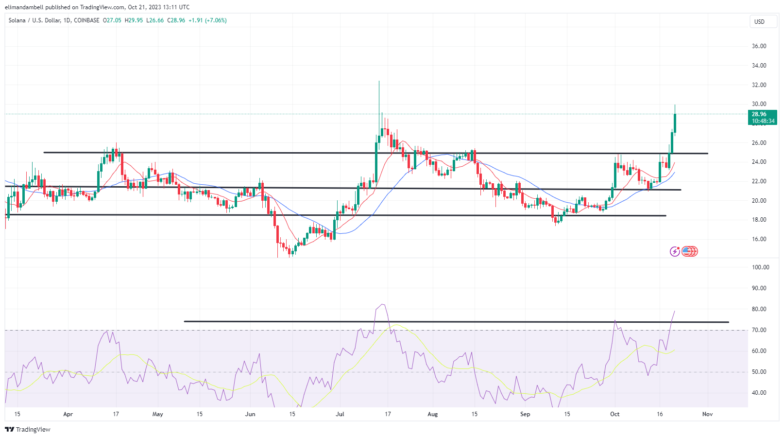 Overall, solana has risen by as much as 33% in the past seven-day period, with today’s surge leading to yet another breakout on the relative strength index (RSI).