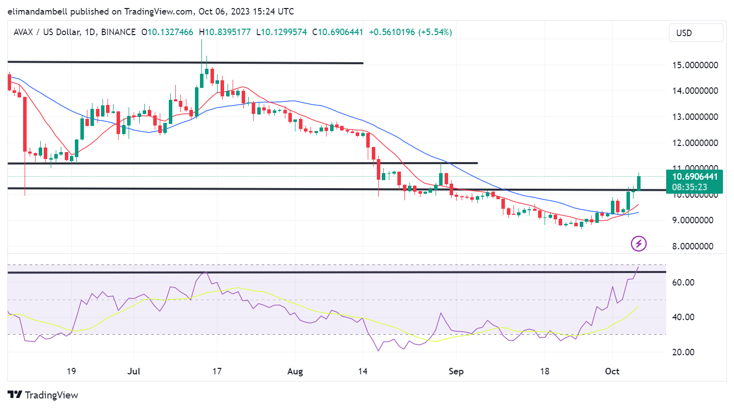 Following a low of $9.85 on Thursday, AVAX/USD rose to a peak of $10.80 earlier in today’s session.