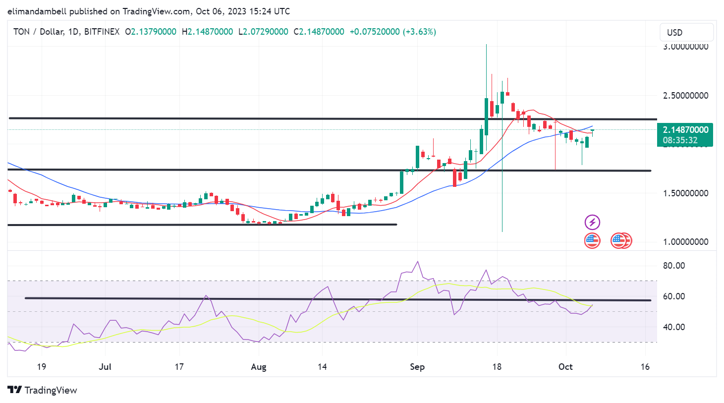 TON/USD jumped nearly 3% higher on Friday, peaking at the $2.15 level at the time of writing.