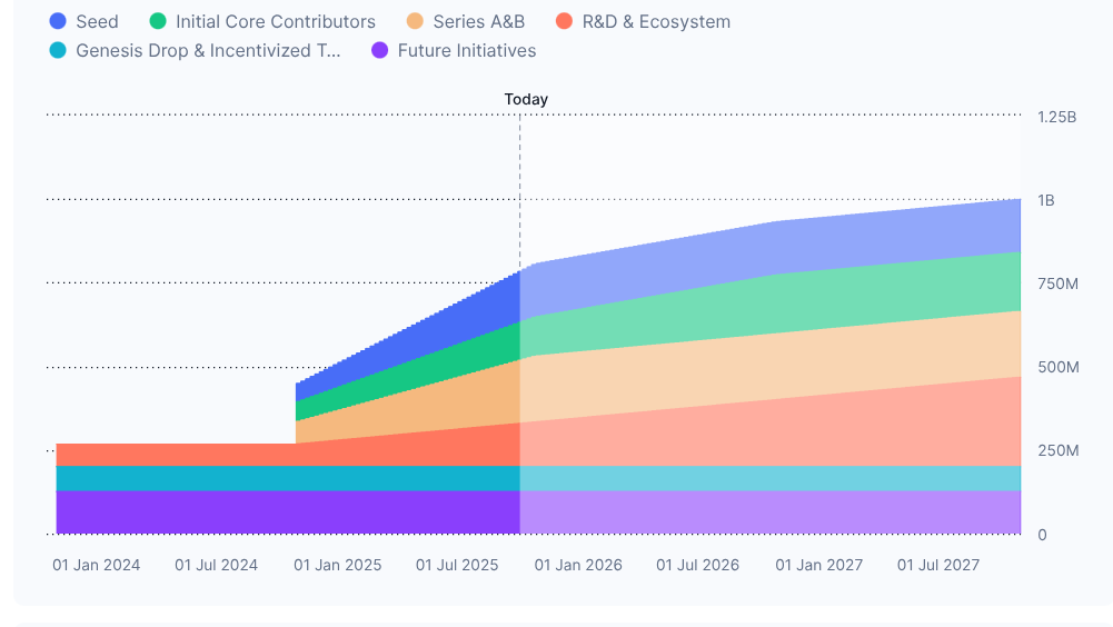 Total supply is 1 billion TIA. There are inflation schedules, unlocks for early investors, foundation, devs. The inflation starts higher and declines annually to a lower rate