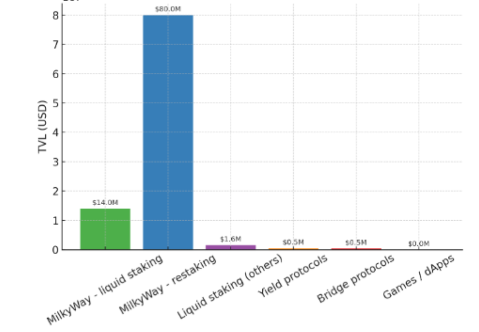 MilkyWay is the flagship liquid staking platform on Celestia, and it’s currently the biggest source of locked value in the ecosystem. The idea is simple in theory, instead of staking your TIA and leaving it frozen, MilkyWay issues a liquid staking derivative, which is stTIA, that represents your staked position. This token can then be used elsewhere in DeFi, meaning you’re not forced to choose between staking rewards and liquidity. It’s effectively trying to replicate what Lido did for Ethereum, but tailored to Celestia’s modular design. MilkyWay reports around $14 million in liquid staking deposits and an even larger figure, roughly $80 million in restaking. Restaking is where things get tricky, it allows users to take their liquid staking tokens and pledge them again into additional protocols, effectively layering yield on top of yield. Now I see this as a house of cards and quite risky, so I only invested a small amount and although I did get rewards, they were minimal.
