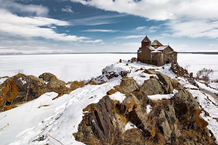 Armenian Hayravank Monastery with the frozen Lake Sevan in the background. Photo by Haykhove, CC BY-SA 4.0.