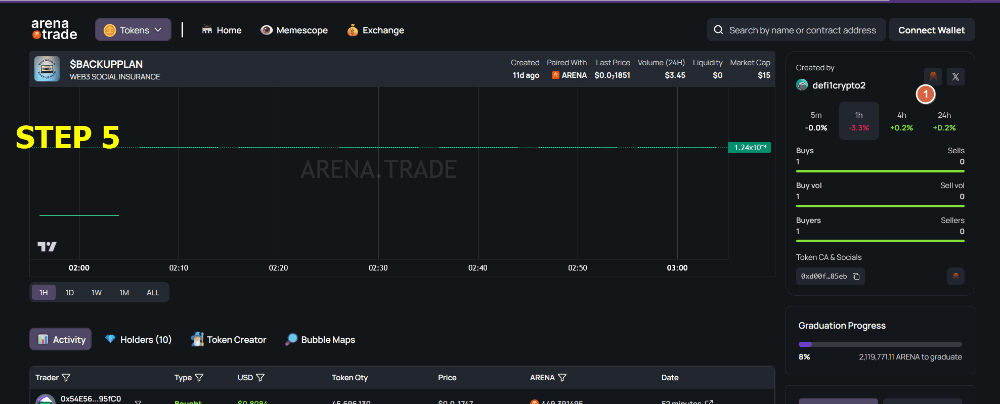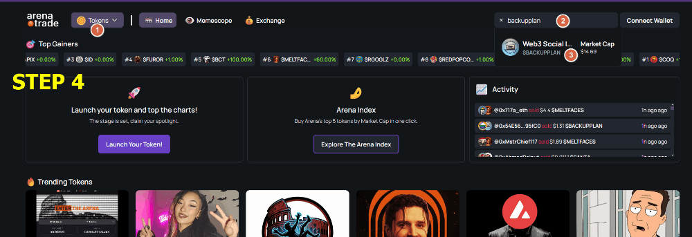On Arena.Trade select Tokens (1), search for "backupplan" (2) and go to the token page (3)