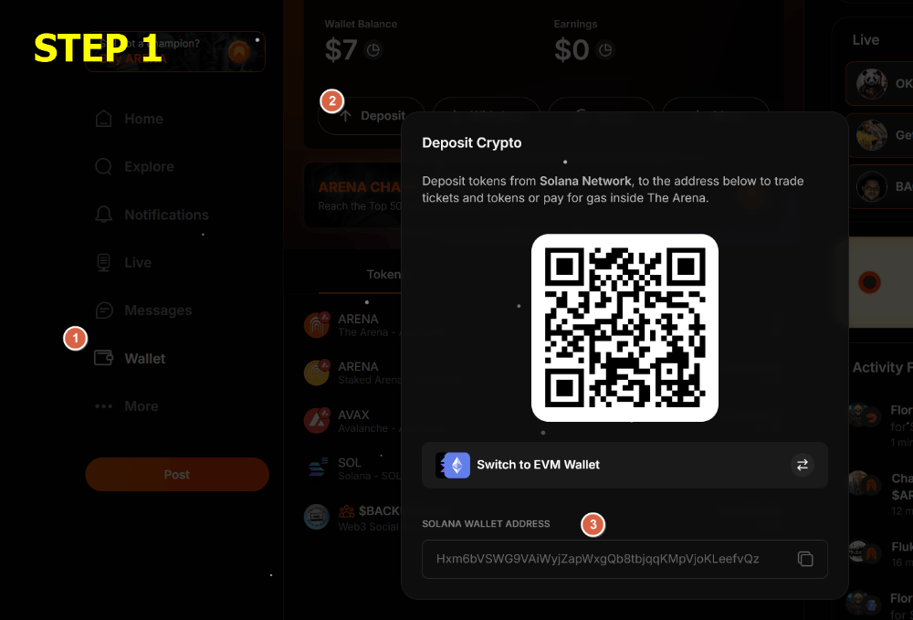 Go to your Wallet (1), click on Deposit (2) and find your Solana wallet (3). Send SOL to your Solana wallet address on The Arena.