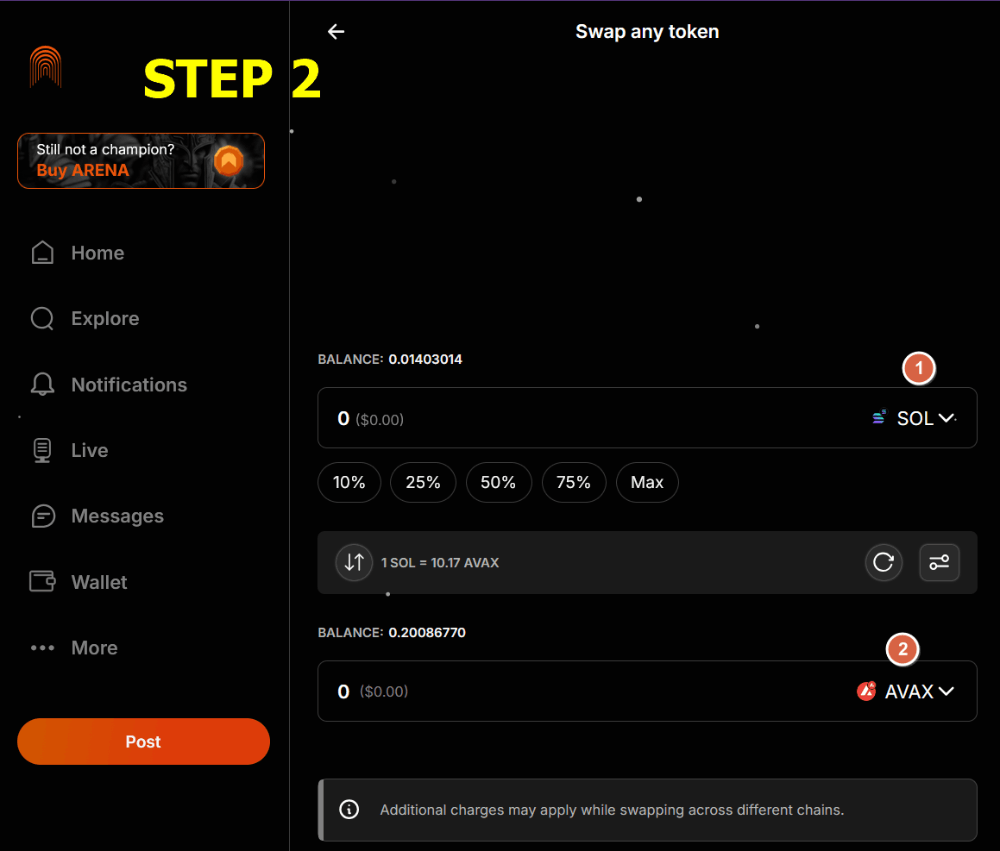 Once you have SOL in your wallet you're going to want to swap it into AVAX to use on the platform. The SOL sits in a Solana wallet on your account which means when you swap The Arena will bridge that SOL from Solana to Avalanche and swap it into AVAX for you. It's all very seamless but it does mean you'll always need some SOL left in your wallet for gas fees. If your transaction fails, check you're leaving enough SOL to pay the fees to bridge out.