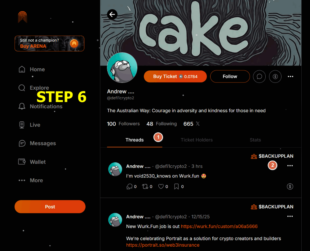 Once you've gone to the creator profile scroll through their Threads feed (1) until you find $BACKUPPLAN posts and then click on the token name on the post itself (2)