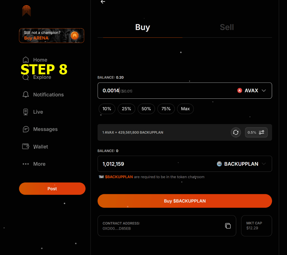To purchase $BACKUPPLAN just click on 'Buy $BACKUPPLAN' from the community front page and you'll be taken to a trading screen where you can Buy/Sell the token. At time of writing the minimum token threshold for $BACKUPPLAN cost approx. 1c USD.