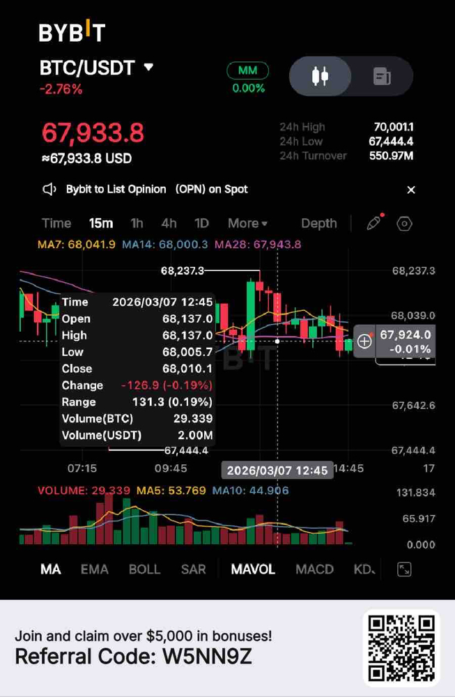 - March 7: Reversal lower — opened around $68K+ but faded to current mid-$67K levels as profit-taking hit and broader risk assets showed hesitation.