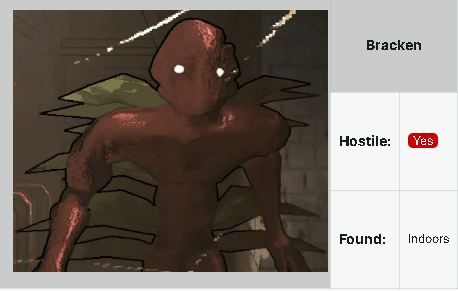 Brackens, also known as Flower Men, are shadowy, humanoid entities in Lethal Company. They quietly stalk players in an attempt to snap their neck and drag away their corpses. They are discouraged by short eye contact, but prolonged eye contact will enrage them.