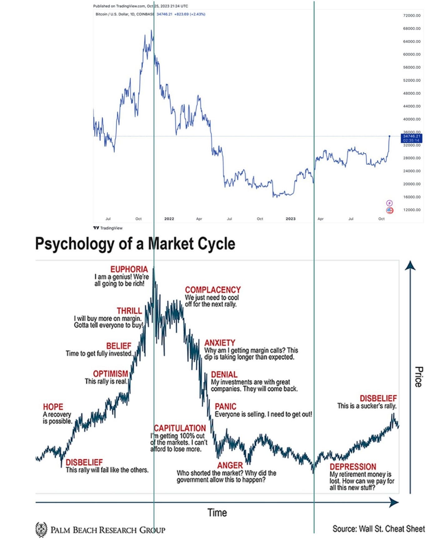 My overarching these is that we are already in the early stages of the bull run, often referred to as the “disbelief” phase. Ellio Trades and Miles Deutscher put together a phenomenal chart that illustrates exactly where we are in the cycle, and the correlation of the BTC chart to the market cycles chart is uncanny.My approach is built on a few simple well researched assumptions.